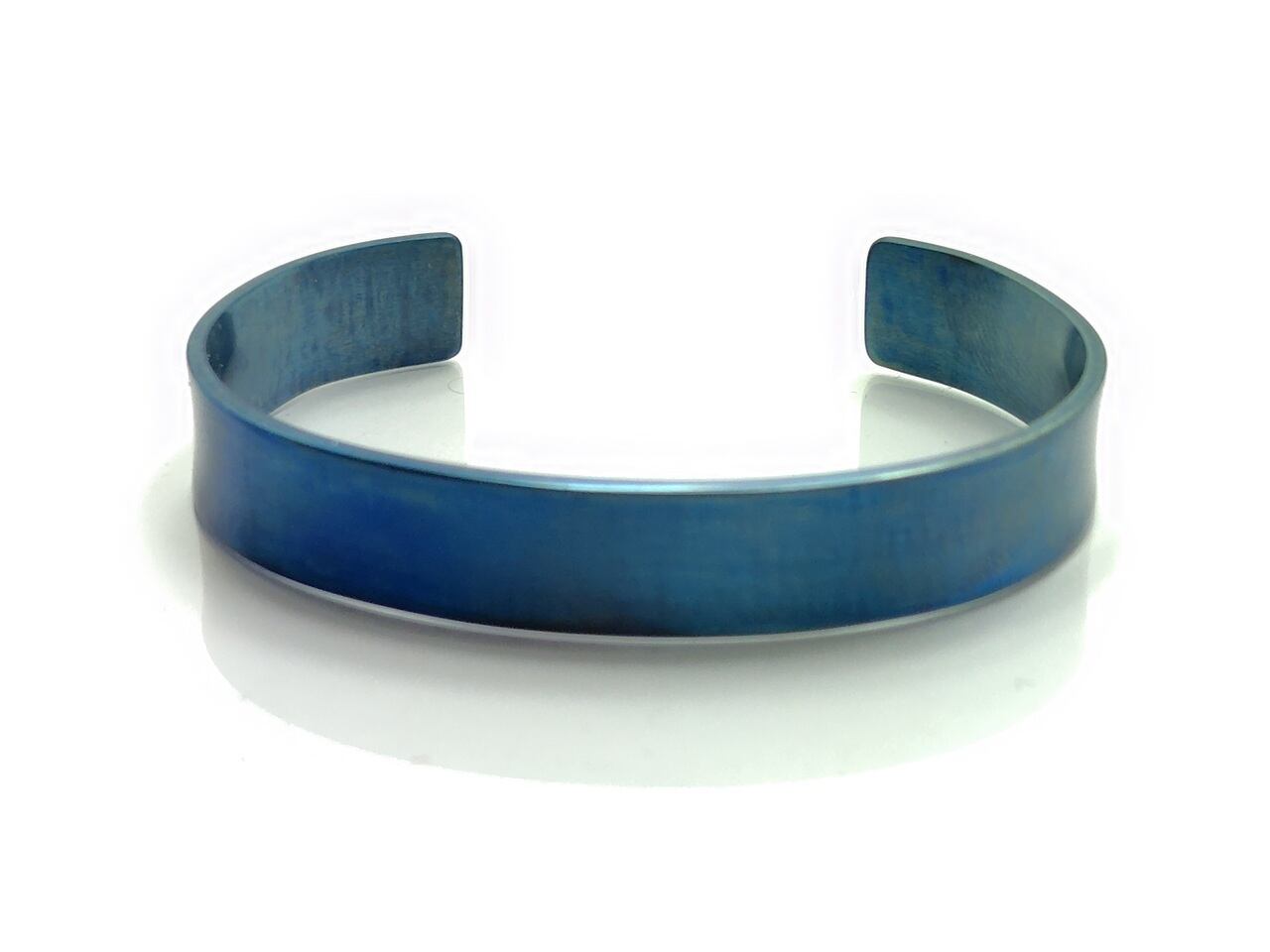 純チタンの板材から切り出し、ハンマーで成形、研磨したシンプルな形状のバングルに更に過熱による着色をしたものです。厳密にはチタンが変色したのでなくその色に見えるようになった透明な酸化膜が形成されています。