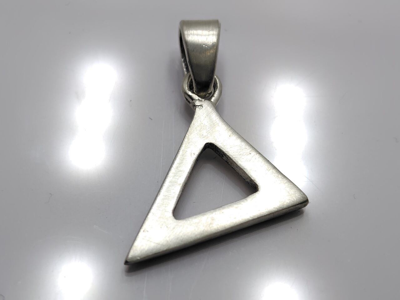 新木目金技法による三角形型フレームのペンダントトップです。正三角形や二等辺三角形のようなきっちりなものにはせず右下に向かって尖っていくシャープな印象の形状の三角形にしています。
