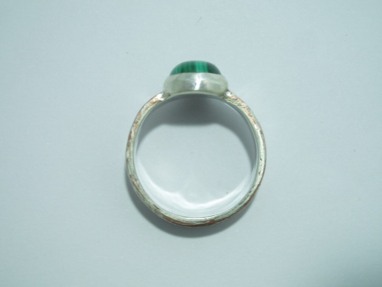 緑と黒の模様のある天然石マラカイトに、新木目金という技術を使用した、銀と銅2色のマーブル状のリングです。(写真は14号のものです)