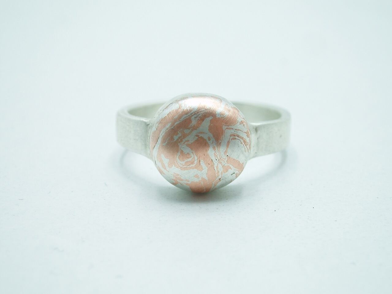純銀性のリングをベースに新木目金という技術を使用したカボション状の銀と銅2色のマーブル状の塊を宝石に見立ててトップにくっつけたリングです。(写真は11号のものです)